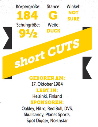 Der finnische Sonnyboy ist nicht nur ein Ass auf dem Snowboard sondern auch ein verdammt guter Skater. Mit zarten 12 Jahren probierte er die ersten Tricks und rollt seither jede freie Minute durch die Straßen Helsinkis bis hin zu privaten Parks in Kalifornien. Selbstverständlich brachte ihm dies nicht nur exzellente Skills auf dem Brett ein, sondern nebenbei mehr Groupies als so manchem Rockstar. Dass Skateboarden einen positiven Einfluss auf künstlerische Fähigkeiten haben kann, glaubt Eero zwar nicht, aber seht selbst, welch perfektes Kunstobjekt er zustande gebracht hat…