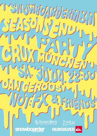 Ab 22:00 Uhr öffnen sich die Pforten des Crux. Früh da sein lohnt sich, denn für die ersten 50 Gäste gibt es prall gefüllte Goodie Bags mit nagelneuen Season’s End Partyshirts und Stuff vom Boarders Shop. An den Turntables sorgen zwei alte Bekannte für ausgelassene Stimmung: Not:FX und Dan Gerous, die auch schon die Party im letzten Jahr beschallt haben hauen euch alte Partykracher und die neuesten Tunes um die Ohren als ob es kein Morgen gäbe. Wer sich von den Qualitäten der beiden schon im Vorfeld überzeugen möchte, kann das hier tun: