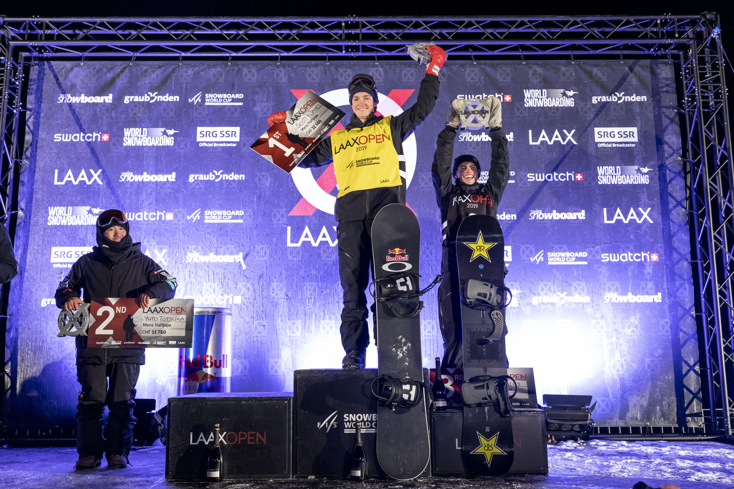 Chloe Kim aus den USA und der Australier Scotty James sind die stolzen Halfpipe Sieger der LAAX OPEN 2019.