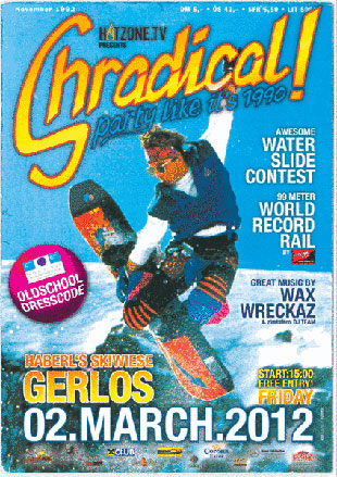 Am 2. März 2012 heisst es auf Haberl’s Skiwiese in Gerlos in der Zillertal Arena “Let’s get Shradical!”. Unter dem Motto “Party like it’s 1990” und dem dazu passenden Oldschool- Dresscode geht die Premiere der “Shradical”-Partyreihe über die Bühne. Weite Snowboard-Pants weichen dem Elho-Overall in Neonfarben vom Dachboden, das High-Tech Brett wird gegen dein erstes Hooger Booger mit Plattenbindung eingetauscht!