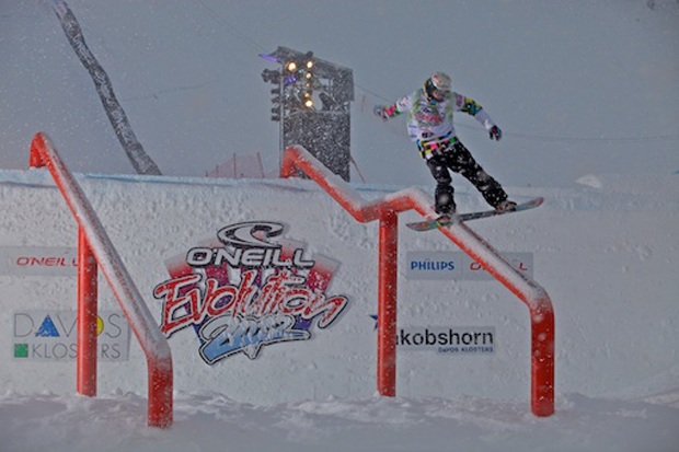 Zum Auftakt des O’Neill Evolution 2012 in Davos erhielt der Winter Einzug in die Schweizer Alpen. Bereits in den Morgenstunden des Qualifikationstags sorgten heftige Schneefälle für erschwerte Bedingungen und verstopfte Straßen. Trotz geringer Sicht konnte die Qualifikation der Männer des TTR 6 Star Big Air und Rail Events wie geplant stattfinden. Jede freie Minute wird von Ridern, Organisatoren und Medienvertretern für zahlreiche Powder Runs durch die umliegenden Wälder genutzt.