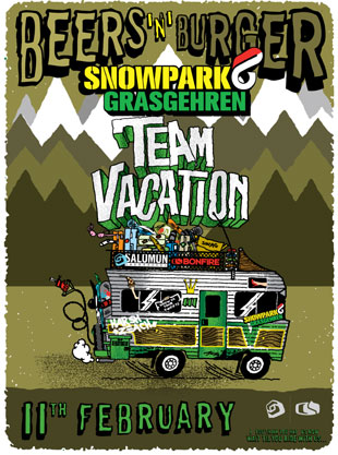 Snowpark Grasgehren lädt zusammen mit dem International Team von Salomon Snowboards und Bonfire Snowboarding zur zweiten Serie der Beers ́N ́Burger Session am 11. Februar 2012.