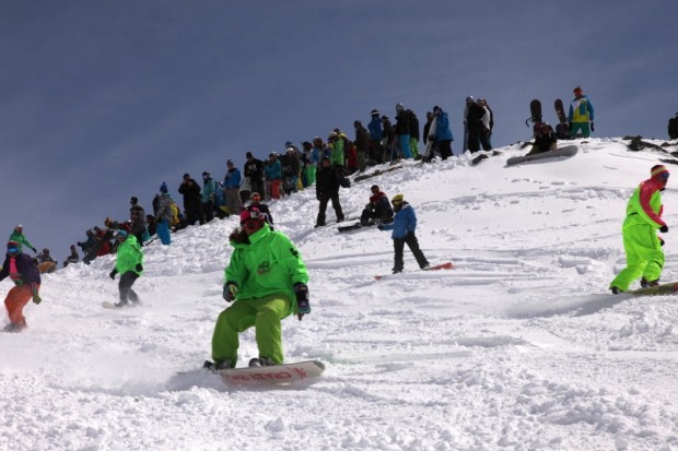 Anschließend war die Oldschool Klasse an der Reihe. Ein Meer aus Neon, 80er Jahre Style, absolut unmöglichen Brillen und Brettern, die teils noch mit Finnen gespickt Waren! Outfitmäßig stach vor allem Martin Freinademetz mit seinem „Oldskuh-l“ Spandex-Anzug mit Kuhflecken ins Auge, ein echter Traum. Aber auch Bertl Kletzmaier ließ sich nicht lumpen und kam stilecht in Caesar-Robe an den Start! Der Scouler Marco Michel nahm sich den Hang dagegen gleich mit Mini-Surfboard und Neopren-Anzug vor, und auch sonst bekam man fast Augenkrebs vor lauter Capricio und Elho Teilen.