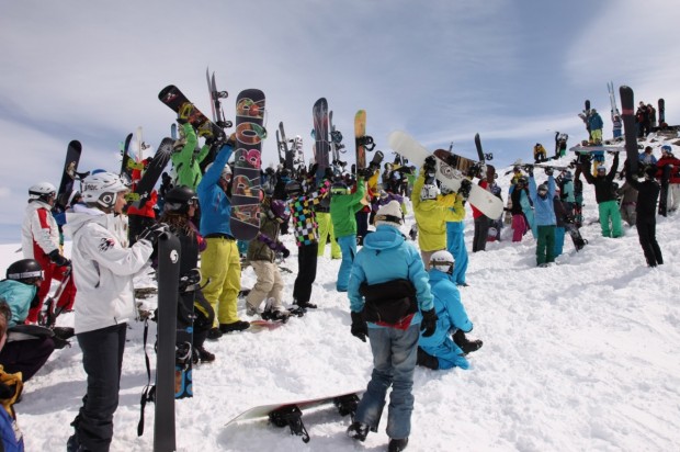 Am Freitagabend hatte Snowboard-Urgestein und LBC Veranstalter Paul Gruber wie gewohnt zur Party in der Mondschein Bar gerufen. Diesmal mit einem Jubiläum: Die Snowboardmarke Rad Air feierte sein 20jähriges Bestehen. Da ließ es sich der Firmenlenker Harry Gunz nicht nehmen, bis spät in die Nacht in der rauchgeschwängerten Luft auf den Sound von AC/DC, Reggae und Funk abzurocken. Wer noch etwas klarer bei Verstand war, zog sich schon etwas zeitiger ins Nachtquartier zurück, und das aus gutem Grund! Denn es hatte am Freitag auf die ohnehin massive Unterlage von 4 Metern noch mal 20 Zentimeter Neuschnee drauf gehauen, weswegen die Albona während des Tages wegen schlechter Sicht gar nicht befahren werden konnte. Da witterten die Powdernerds natürlich ihre Chance für ein paar letzte unverspurte Lines des Winters, und das auch noch unter strahlendem Sonnenschein, der fürs Wochenende angekündigt war!