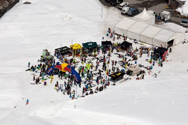 Um zwölf Uhr hieß es dann auf zum Rennen! Anders als in den letzten Jahren wurde dieses Jahr leicht versetzt an einem etwas flacheren Hang gestartet, was den gut 400 Rennteilnehmern eine völlig neue Spielwiese voller Wechten und Kuppen eröffnete. Am Start stimmte Dani „Kiwi“ Meier die Teilnehmer mit dem Megaphon auf das Rennen ein und gab noch den Tipp, die mehr als 1000 Höhenmeter ohne einen Schwung durchzuheizen. Als erstes durfte dem die Master Class nachkommen, die mit Brettern über 172cm Länge bei den Männern und 162cm bei den Frauen an den Start gingen. Ralph Castelberg (CH) nahm sich Kiwi’s Worte besonders zu Herzen und raste mit deutlichem Vorsprung als erster durch den Red Bull Zielbogen. Bei den Damen kam Liz Kristoferitsch (AT) mit der neuen Abfahrt am besten zurecht und glühte als erste Frau durchs Ziel.