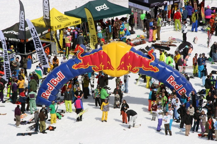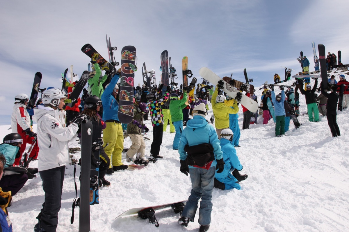 Um zwölf Uhr hieß es dann auf zum Rennen! Anders als in den letzten Jahren wurde dieses Jahr leicht versetzt an einem etwas flacheren Hang gestartet, was den gut 400 Rennteilnehmern eine völlig neue Spielwiese voller Wechten und Kuppen eröffnete. Am Start stimmte Dani „Kiwi“ Meier die Teilnehmer mit dem Megaphon auf das Rennen ein und gab noch den Tipp, die mehr als 1000 Höhenmeter ohne einen Schwung durchzuheizen. Als erstes durfte dem die Master Class nachkommen, die mit Brettern über 172cm Länge bei den Männern und 162cm bei den Frauen an den Start gingen. Ralph Castelberg (CH) nahm sich Kiwi’s Worte besonders zu Herzen und raste mit deutlichem Vorsprung als erster durch den Red Bull Zielbogen. Bei den Damen kam Liz Kristoferitsch (AT) mit der neuen Abfahrt am besten zurecht und glühte als erste Frau durchs Ziel.