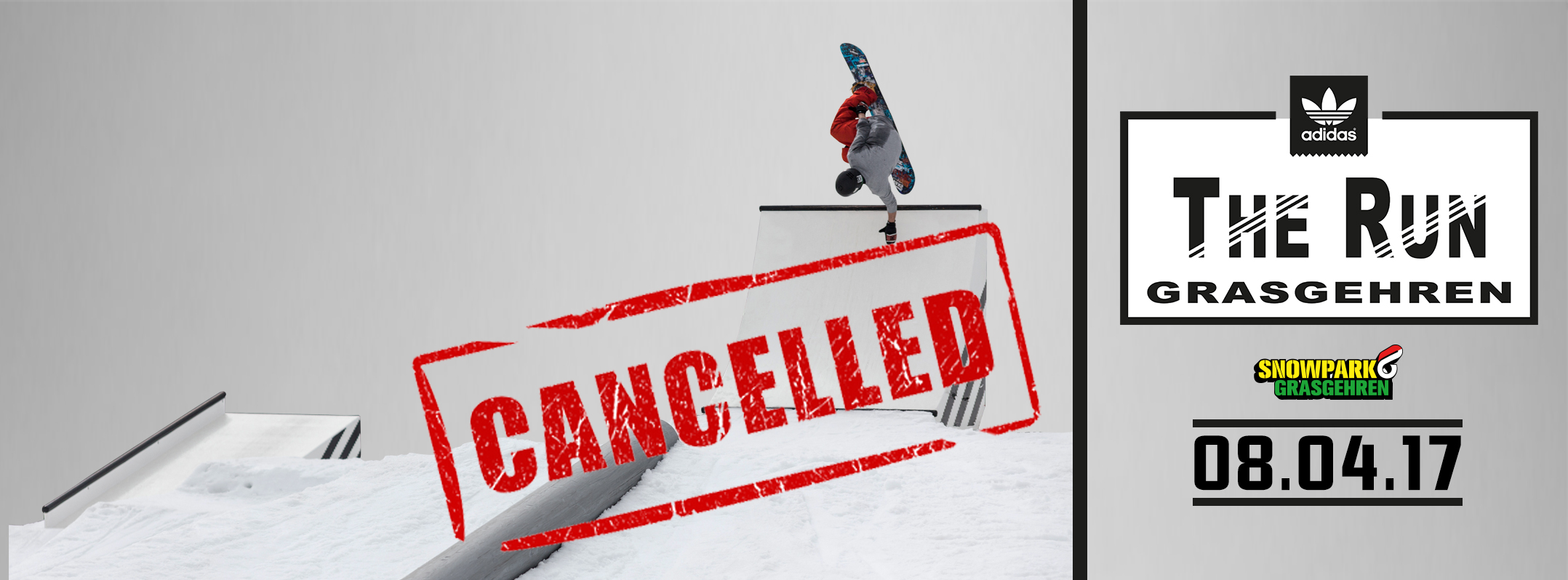 Aus Grasgehren erreicht uns gerade die Nachricht, dass aufgrund der Schneesituation und Witterung der Liftbetrieb eingestellt werden muss und dadurch das adidas Snowboarding-Event „THE RUN“ diese Saison leider nicht stattfinden kann. Grasgehren verabschiedet sich daher aus der Saison 16/17 und man darf jetzt schon gespannt sein, was sich das Team für die nächste Saison einfallen lässt.