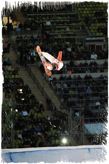 Im Halbfinale ist die Stimmung in den Rängen durch den Auftritt von Billy Talent und die zusätzlichen Runden Bier aufgeladen. Das Publikum hat Blut geleckt. David kann sich knapp gegen Heikki mit seinem Double Cork behaupten und steht im Superfinale, Travis setzt sich gegen Mathieu mit einer sauberen Cab Inverted 9 to Bs Rodeo 5 Line durch und Risto haut mit Cab 9 to Bs Rodeo 5 den Gewinner von 2005, Hampus, aus dem Rennen. Und dann die grosse Überraschung. Shaun gegen Antti, ein Duell der Titanen. Doch Antti knackt mit einem Fs 1260 Tailgrab, den er perfekt in den Schnee stellt, fast die 300er Punktemarke. Was für eine Ansage! Autti Rufe schallen durch die Reihen. Shaun riskiert alles, probiert als Konter einen Cab 1260 – den ersten in seiner Karriere -, landet den auch ohne Tadel und setzt noch einen Cab 5 über den Roller drauf. Doch den drei Judges genügt dies nicht. Für sie ist Finnland und damit Antti der Mann fürs Superfinale. Damit hätte keiner gerechnet. Der Mann, der eigentlich dafür geboren worden ist, jeden Contest souverän zu gewinnen, scheidet schon im Halbfinale aus. Goodbye Shaun White. Enttäuschung beim Publikum? Pustekuchen! Mit „Autti“ Chören feiern die Zuschauer sein Weiterkommen und verabschieden Shaun mit demselben Enthusiasmus. Sie sind bereit für das Superfinale der Superlative. Hier treffen vier aufeinander, bei denen jeder dem anderen das Wasser reichen kann. Aber im Finale zählen nur Punkte, jetzt heisst’s jeder gegen jeden, wieder 3 Runs pro Kopf. Der komplette Stadion-Innenraum schwankt vor Menschen. David dropt unter dem Gejohle des Publikums in seinen ersten Run. Als hätte er nie etwas anderes gelernt, zwirbelt er abermals seinen Double Cork über das Kicker-Monstrum und kommt wie eine Eins in der Landung auf.