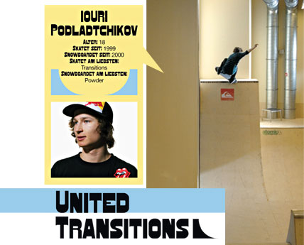 Der Schweizer, der eigentlich ein Russe ist. Iouri Podladtchikov ist eine Art helvetisches Pendant zu Shaun White – zumindest noch im kleineren Maßstab. Ein junges Ausnahmetalent an Snowboarder, der von seinen Sponsoren auch die Unterstützung beim Skaten innehat. Wenn man ihm auf einem der beiden Boards begegnet, ist es ziemlich schwer zu unterscheiden, ob jetzt ein Skate- oder Snowboard Pro an einem vorbeirollt. Ein geschmeidiges Kätzchen, das immer auf den Füßen landet. Locker flockig lupft er seine ausgefallenen Tricks über Kicker und Coping.