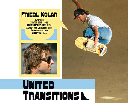 Friedl Kolar, ein Ästhetiker der ersten Stunde, mit Leib und Seele Snowboarder und Zillertaler. Ein pragmatischer Kerl, der neben seinen Boards nicht viel braucht, um glücklich zu werden. Wenn er losgelassen wird, zerlegt er die Obstacles, die ihm in den Weg gestellt werden, mit einer schier unbändigen Motivation und dem Hang zur Hyperaktivität. Immer auf der Suche nach was neuem, immer dahinter seine Kollegen bei einer Session noch mehr zu pushen. Und wenn seine große Leidenschaft Skateboarding ins Spiel kommt, tritt in seine Augen dieses seltsame Leuchten, wie bei einem kleinen Jungen.