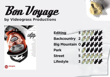 „Bon Voyage“ ist für diejenigen ein Muss, die von Street Rails, Wallrides und urbanen Bomb Drops nicht genug bekommen. Für die richtige Street Credibility wird ordentlich gequarzt und hin und wieder eine Bierflasche zerschlagen. An Lifestyle-Shots mangelt es also nicht und die Crew macht ihrem Chaos-Image, egal ob mit Buggy in Chris Greniers Garten oder bei der Massenabfertigung von Bierdosen, definitiv alle Ehre. Für den Snowboarder unter euch, der auf Abwechslung steht und gerne mehr Schnee als bloss in Inrun und Landung sieht, wirkt der Streifen spätestens zur Halbzeit doch ziemlich eintönig. Highlights wie die Parts von Ben Bilocq, Chris Grenier, Justin Bennee und Jed Anderson haben nichtsdestotrotz das Potenzial, auch den weniger Street-Affinen unter euch wahnsinnig grosse Lust auf Snowboarden zu machen. (mk)