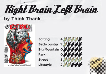 Bei Think Thank bleibt man neurologisch. Das in Anlehnung an ihren Klassiker „Thanks Brain“ auf den Namen „Right Brain Left Brain“ getaufte Doppel-DVD-Feature liegt in den Shops und wird die Rail-Fans aus der Reserve locken. So bietet sich dem Zuschauer auf den beiden DVDs „Right Brain“ und „Left Brain“ vor allem Street Snowboarding erster Güte. Nick Visconti eröffnet den Film mit Jibbereien wie einem Frontflip Frontside Boardslide. Auch Chris Beresford gibt sich innovativ und zeigt mit einem Kickflip, dass Skateboarding und Snowboarding noch immer so unzertrennlich sind wie Eisbär-Mützen und Skifahrer. Think-Thank-Mastermind Jesse Burtner verbringt seine Zeit im Powder am liebsten one-footed und liefert mit seinem Part ein absolutes Highlight in Sachen innovatives Snowboarding. Pat Milbery setzt dem allem noch eins obendrauf und stillt mit einem Darkslide (!) die Bedürfnisse aller Rodney-Mullen-Fans. Der letzte Part der ersten DVD geht an Scott Stevens, der sich via One-foot Backflip Bonk am Sessellift vorbeikatapultiert und gerne auch mal einen Banana Slide an Handrails zeigt. Im Anschluss an Stevens’ Part heisst es plötzlich: „Please change the disc“… Das hätte auch eleganter gelöst werden können! Nach dem DVD-Wechsel erhält die Think-Thank-Crew weibliche Verstärkung: Jess Kimura sieht aus wie ein Kerl, steckt ein wie ein Kerl und shreddet Rails wie ein Kerl – Hut ab! Chris Larson hat zwar nicht viel Style, aber eine ausgeprägte Leidenschaft für Gaps vor, nach und zwischen Rails und genügend Balance für Backside Nosebluntslides an Triple Kink Ledges. Sein Landsmann Blair Habenicht hat den ersten ernst zunehmenden Powder-Part. Was Habenicht hier abliefert, kann guten Gewissens als radikal bezeichnet werden und wird nicht zur Nachahmung empfohlen! Dank Ben Bogart flimmert dann doch noch eine Baggy-Pants über den Bildschirm. Abgesehen davon steckt Bogart trotz unübertrefflicher Board-Kontrolle hart ein, wird hierfür aber mit einem technisch anspruchsvollen und vor allem stylishen Part belohnt. Sean Genovese ist offensichtlich bereit, das Erbe von Mikey Leblanc anzutreten, und droppt so ziemlich alles, was bei drei nicht ebenerdig ist. Der Final Part von „Right Brain Left Brain“ geht – verdient oder nicht, sei mal dahingestellt – an Jason Robinson. In Sachen Trickniveau bewegt sich Robinson wohl im Think-Thank-Mittelfeld. Trotzdem bleibt ein guter Gesamteindruck, da es der Libtech-Teamrider als einer der wenigen Fahrer in „Right Brain Left Brain“ versteht, im Powder und auf Rails zu überzeugen.