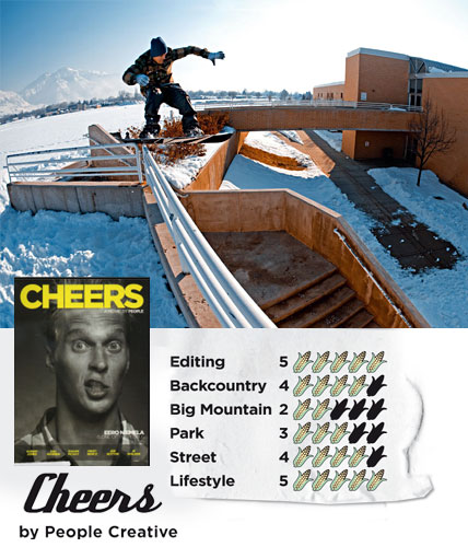 Starke Charaktere in einem noch stärkeren Snowboard-Movie machen „Cheers“ zum Oscar-verdächtigen Must-have in eurem DVD-Regal. Das Cover der DVD gibt’s in zwölf Variationen, jeweils mit zwei unterschiedlichen Fahrern vorne drauf. Geht also schleunigst zum Händler eures Vertrauens, kauft euch euer Lieblingsexemplar und baut ihm einen Altar in eurem Wohnzimmer direkt neben den Familienfotos. People Creative für die Ewigkeit! (mk)