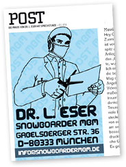 Auf unserer Reise in die eigene Vergangenheit bzw. in die Tiefen des Archivs sind wir einer Person immer wieder begegnet, die euch allen noch bestens bekannt sein dürfte. Seit Anbeginn der Zeit eine feste Instanz im MBM, eine Koryphäe auf dem Gebiet des gehobenen Stils und der feinen Ausdrucksweise: Dr. L. Eser. Jahr um Jahr hat er sich mit einer Hingabe, die ihresgleichen sucht, den Anliegen der Leser gewidmet. Seine unnachahmlich charmante Weise, Klartext zu sprechen, hat ihm über die Jahre eine treue und ergebene Gemeinde gebracht. Egal ob Sorgen oder freudige Ereignisse, der Doc hatte auf jede Sticker-Anfrage die passende Antwort parat. Böse Zungen behaupten, der gute Doktor hätte die Antworten unter Drogen mit sarkasmusgetränkter Feder aufs Papier gebracht und die Briefe mit Wonne in der Luft zerrissen. Dies wird seiner jahrelangen snowboard-therapeutischen Arbeit je doch nicht gerecht; wer einmal einen Brief geschrieben und eine Antwort erhalten hat, wird das bestätigen. Mit dem Zeitalter des Internets und der abnehmenden Bereitschaft, Briefe zu schreiben, verlor der gute Mann immer mehr die Freude an seiner Arbeit. Wer weiss, nach dem Zusammenbruch des Internets wird er vielleicht wieder auferstehen wie Phönix aus der Asche und euch mit seinen Weisheiten in den Arsch treten. Wir hoffen es.