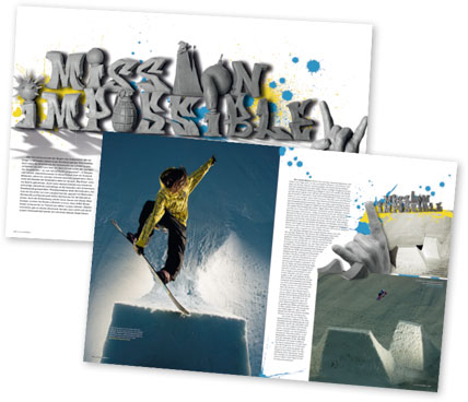 Das ist die Geschichte eines Arbeitstitels, der es zur Headline schaffte. Die Idee war, völlig abgedrehte Obstacles zu bauen, um endlich unseren Hoffotografen mal wieder aus dem Tiefschnee in den Park zu locken. Die vier Shootings verliefen aber alles andere als reibungslos. Es ging alles in die Hose, was nur in die Hose gehen konnte… Das Projekt wurde zur Odyssee für Fahrer und den Fotografen und so wäre der Arbeitstitel „Mission Impossible“ beinahe Programm geworden. Dank der Shaper, der dicken Eier der Fahrer und der Erfahrung des Fotografen gelangen trotz der katastrophalen Umstände aussergewöhnliche Aufnahmen. Bei all diesen Widrigkeiten ebenfalls als unmöglich erachtet: Nicht nur auf dem MBM-Cover und in der Story strahlten die Fotos, sondern sie schafften es auch in diverse Magazine im Ausland!