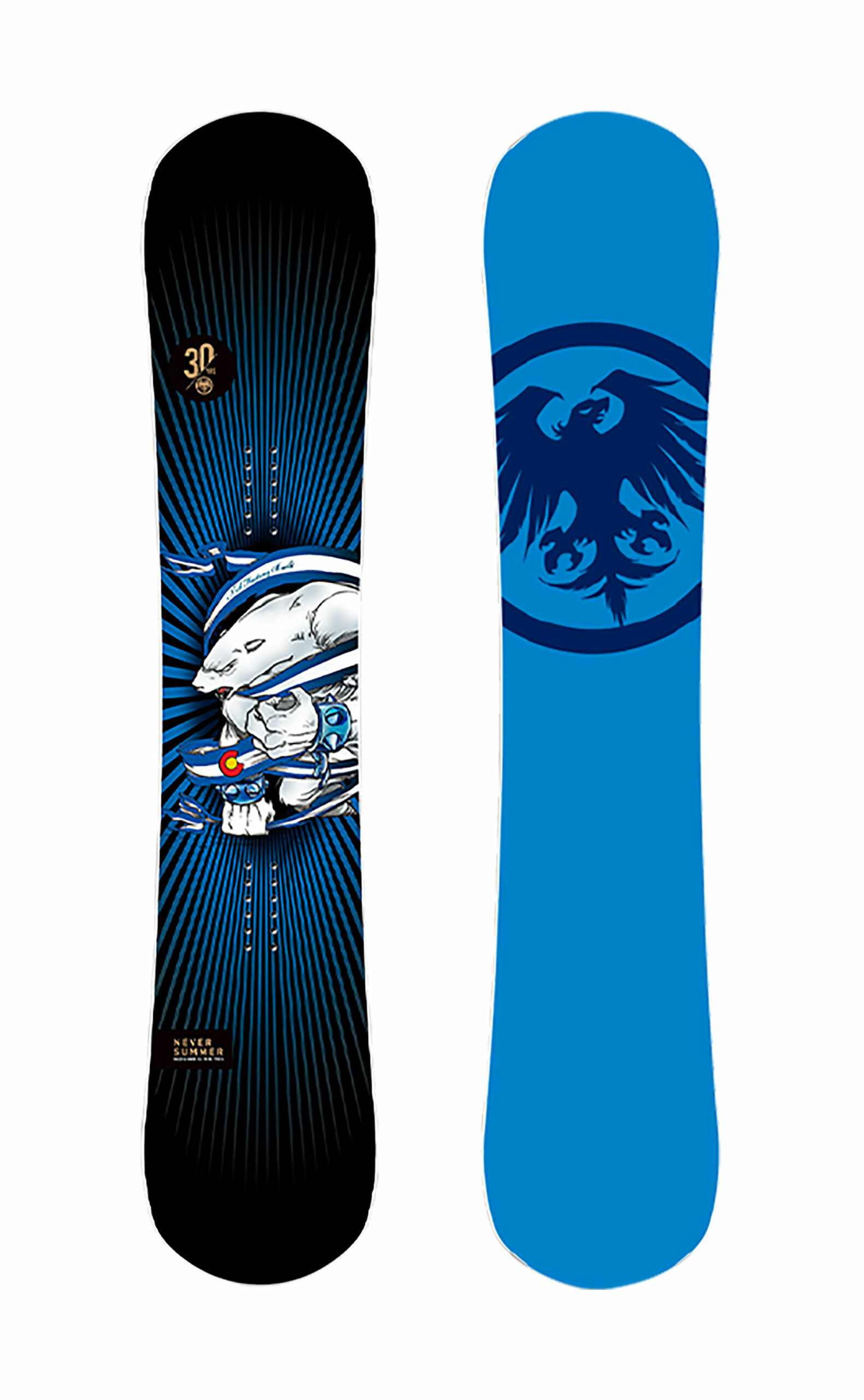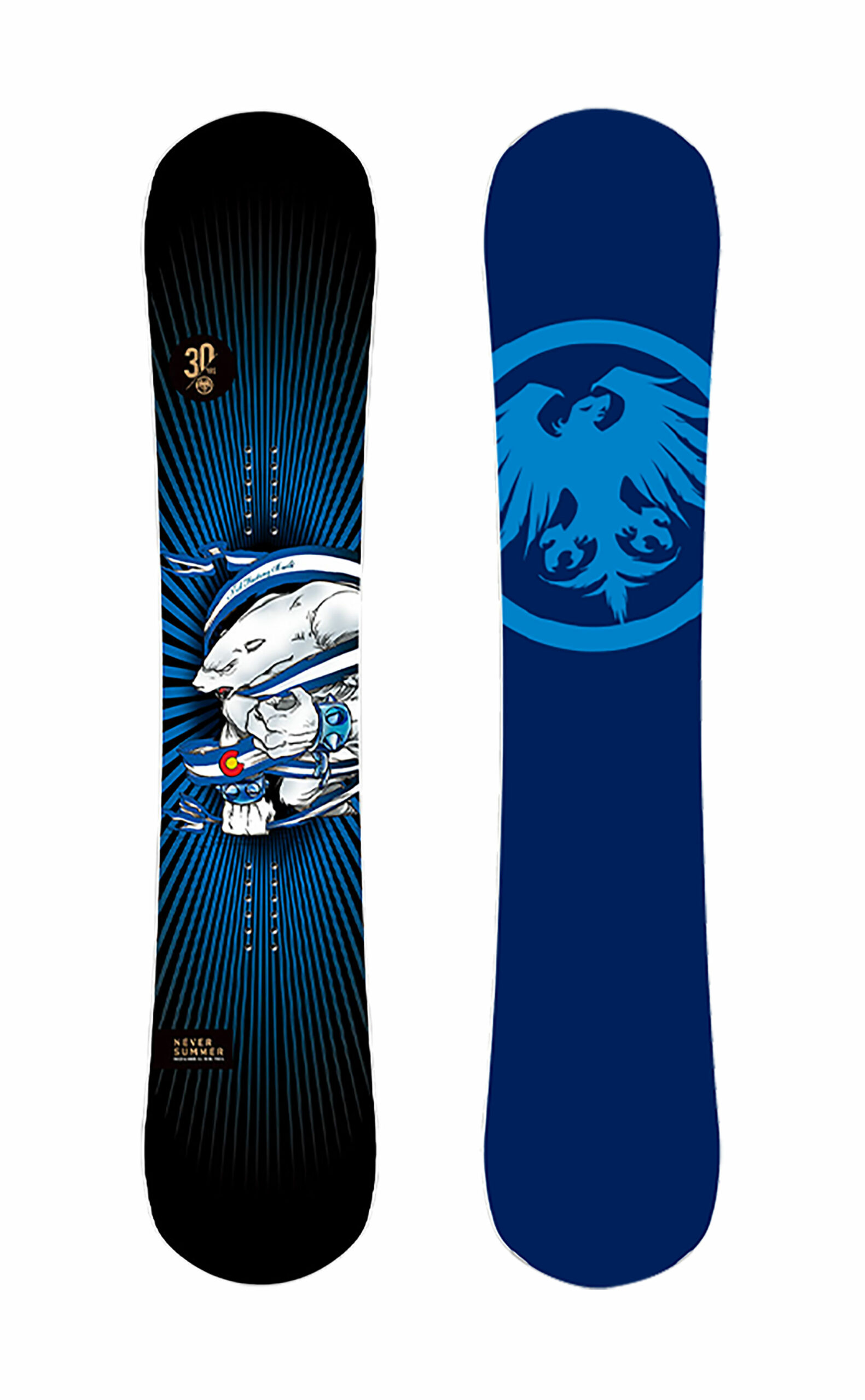 Das belegt auch die neue Board-Serie. Mit der “30th Anniversary Range” feiert Never Summer sein rundes Jubiläum. Die Grafiken der Boards sind dabei an die Anfänge von Never Summer angelehnt. Das zeitlose Eisbärendesign kommt vom in Denver ansässigen Künstler Sam Turner. Die Limited Edition zum Geburtstag umfasst die Modelle Proto Synthesis für Frauen und Männer, den Swift und das neue „High-End“-Camber-Modell Hammer.