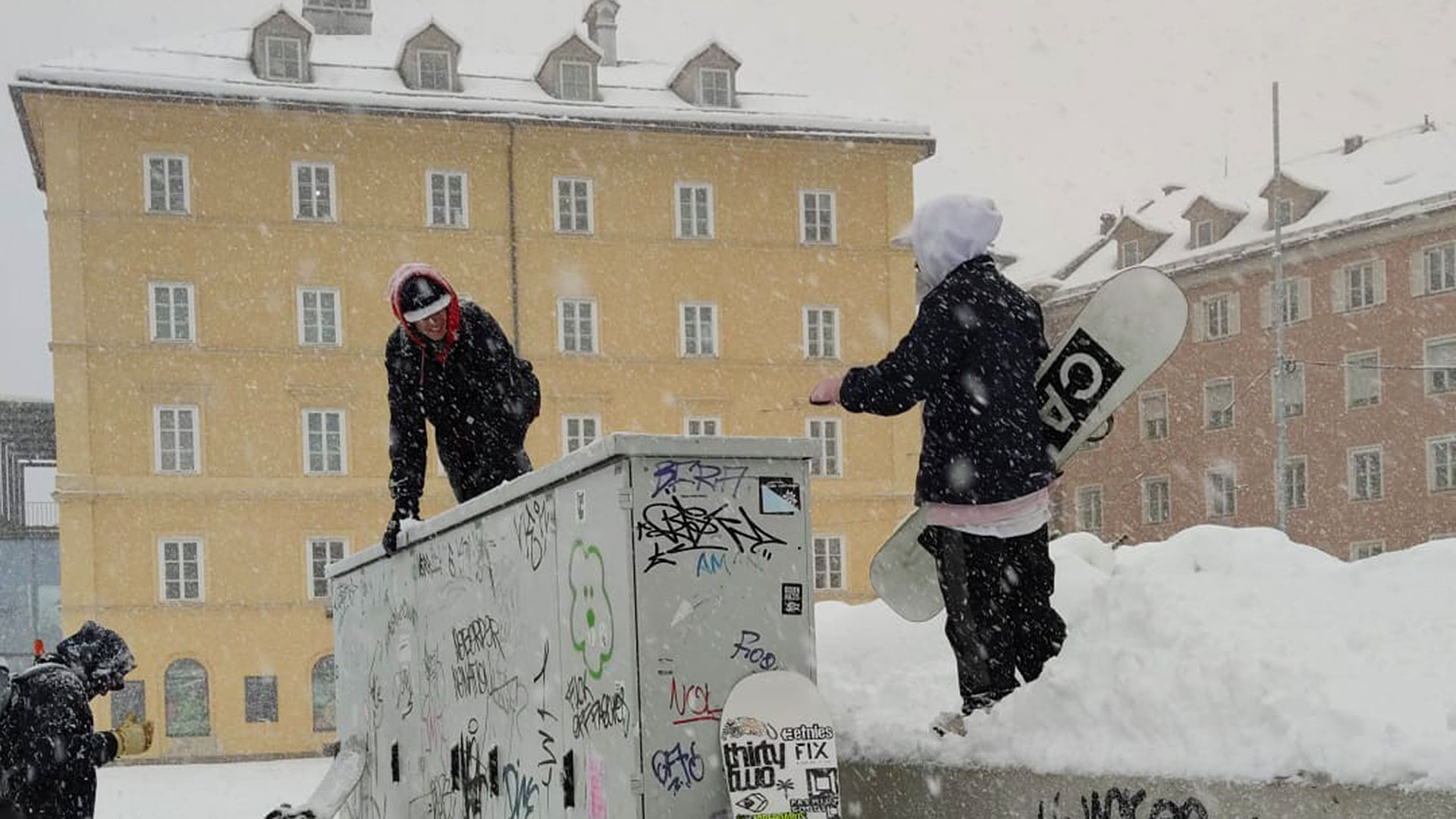 Innsbruck war im Januar komplett weiß. Es herrschte Ausnahmezustand in der Stadt. Genau deshalb sind wir gleich losgezogen und haben uns in kleinen Gruppen nach Spots umgeschaut. Wir, das sind Ozzy, Kirschi und viele andere Rider aus dem Umfeld des Canary Cartel und der UFO Gang.