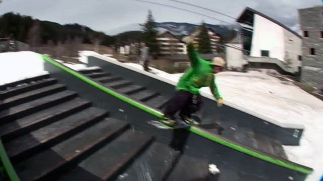 Das IOU-Stairset in Laax dürfte eines der beliebtesten Jib-Obstacles in der Alpen sein. Da dürfen natürlich auch die sane!-Ripper Michi Schatz, Klaus Lotto, Steve Grumser, Davo...