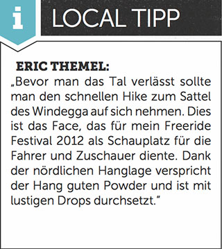 Der weitläufige Minimalismus zeigt sich am deutlichsten bei den Freeriderouten. Gleich vier abwechslungsrei- che Varianten über der Baumgrenze stehen zur Wahl, um Tag für Tag neue Unterschriften in den Powder zu setzen. Aus der Gulmabahn kann man zudem Lines voller Pillows und durch Lawinenverbauungen scouten, die direkt unter der Trasse entlanglaufen. Der breite Waldgürtel darunter eignet sich dagegen bestens für kontrastarme Schlechtwettertagen, wenn der Nebel die Sicht gleich Null setzt. Berüchtigter Höhepunkt ist das Face entlang der Windecker Spitze, wo schier endlose und anspruchvollste Hänge ein dankbares Motiv abge- ben. Nur logisch, dass das angesehene Freeride Festival by Eric Themel auf diesem Spielplatz stattfindet.