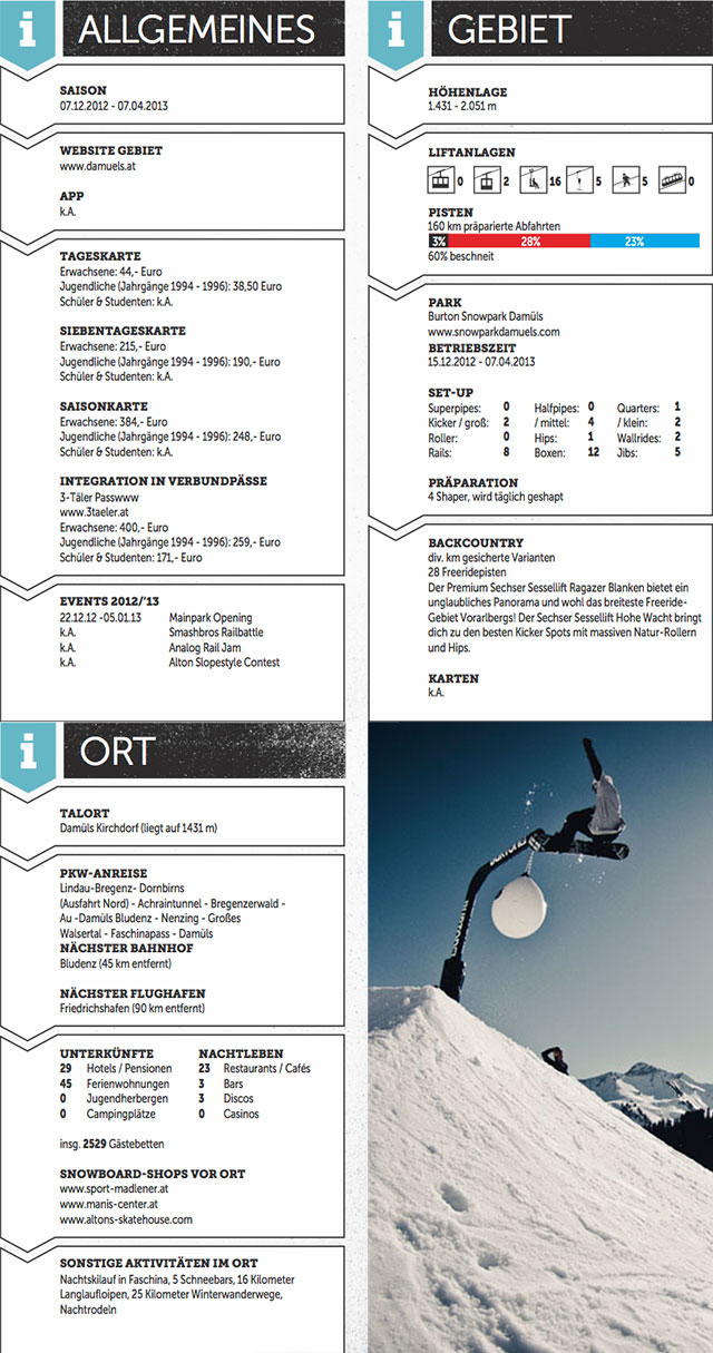 Egal wen man fragt, der prägendste Eindruck von erfahrenen Locals klingt unisono gleich: „abwechslungsreich und verspielt“ die Antwort. Denn das Gebiet – seit drei Jahren durch die Verbindung zum Nachbardorf als Damüls-Mellau-Faschina zusammengeschlossen – vereint ein Gelände, das sich sorgenfrei als das „Lake Tahoe Europas“ bezeichnen lässt. Die Hänge unter der Mittagsspitze vereinen den gesamten Katalog an anspruchsvollem Riding: mellow beim Sessel Oberdamüls, sportlich bei Hasenbühel und knackig bei Sunnegg.