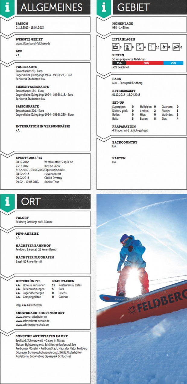 Früher stand der Schwarzwald für zwei Dinge: Kuckucksuhren und Kirschtorte. Heute ist er dank des Wintersportgebiets am Feldberg und dem dazu- gehörigen Bohny Snowpark um eine Attraktion reicher. Der höchste Berg im Schwarzwald bietet abwechslungsreiche Pisten,einen beachtlichen Fun Park, einige schmucke Backcountry Spots und liegt vor den Toren der Studentenhochburg Freiburg.