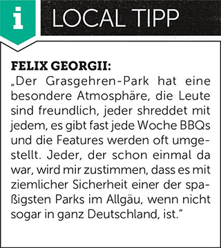 Als Teil der Hörnerdörfer liegt die Talstation Grasgehrens auf 1.447 Metern am Fuße des Riedbergerhorns im hintersten Eck des Oberallgäus. Trotz der relativ geringen Höhe des Gebiets, welches sich bis auf knapp 1.700 Meter Höhe erhebt, gehören Schneefälle im Kessel der Grasgehren-Alpe von Dezember bis Mitte April zum Tagesgeschäft. Mit dieser Schneesicherheit kann der Funpark Grasgehrens auch als einer der ersten im Allgäu in die Saison starten. Und dass der Park auch wirklich von der ersten Schneeflocke bis zum letzten geschmolzenen Slush immer wie geleckt dasteht, ist den Jungs vom Unit Parktech um Headshaper Tajo Seefried zu verdanken.