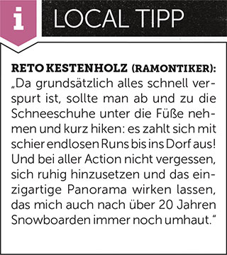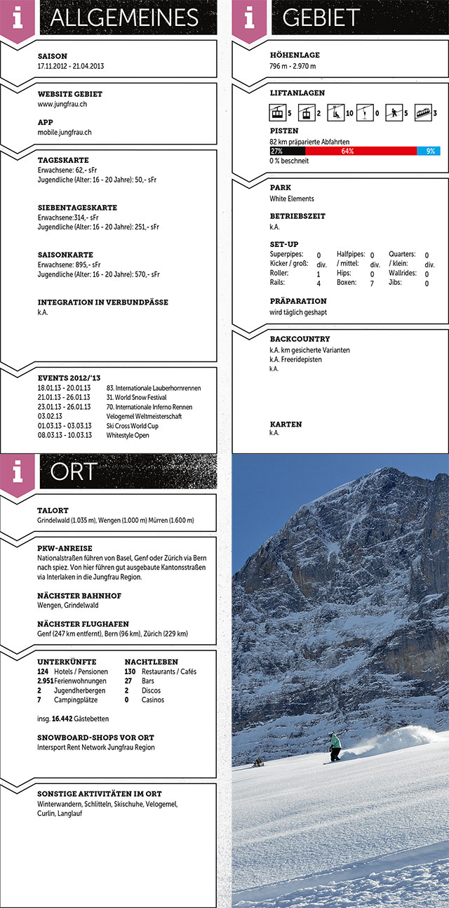 Der White Elements Pro Park selbst liegt schon weit über Durchschnitt („danke dass sie mit White-Elements geflogen sind“), mit der Pipe schießt die Jungfrauregion dann endgültig den Vogel ab: dieses Monster ist nicht nur eine der größten Europas, sondern auch eine der fotogensten. Jeder Snowboard-Fotograf sollte schon mindestens ein Bild im Portfolio führen, auf dem die zerklüfteten, vergletscherten Felswände der Eiger-Nordwand im Hintergrund thronen. Das ist ganz großes Alpentennis.