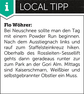 Rund um die Steinlingalm und vom Sultengipfel, zwi- schen den Bäumen, schwimmt es sich im Powder mit einem Wonnegefühl wie es wohl sonst nur Dagobert Duck in seinem Geldspeicher kennt. Das Kanonenrohr bietet sich grade dazu an bei Neuschnee durchzuschießen. Wer sucht der findet – einige spaßige Treeruns warten auf Entdeckung in Richtung Talabfahrt.
