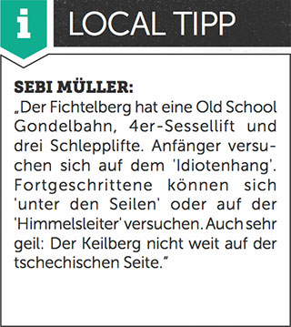 Erster Eindruck vom Tal aus: hier gibt’s jede Menge Wald – perfekt um den ein oder anderen Treerun hinzulegen. Also gleich runter zur Himmelsleiter oder an die Skischanzen, dort liegen unter den Baumwipfeln Powderpatches versteckt. Zwischendrin finden sich immer wieder Obstacles in Form von Baumstümpfen und kleinen Hütten, die man auf dem Weg mitnehmen kann. Der 1er-Sessellift am kleinen Fichtelberg ist die erste Anlaufstelle nach einem Dump: Hier einen Kicker in die Waldschneise reinsetzen und die Session kann beginnen.