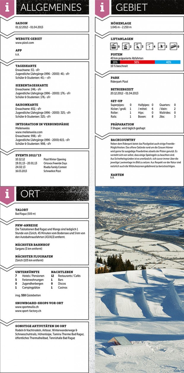 Im Riderpark Pizol, zwischen Gaffia- und Furtlift, kommt man sich vor wie ein Kind im Süßwarenladen: drei Lines mit Kickern und Jibs von Beginner über Medium bis Pro lassen einem das Wasser im Mund zusammen laufen. Die Beginner Line bietet zwei Kicker und sechs verschiedene Boxen. Der Knüller steht in der Medium Line: der Gong Bonk. Eine gut 1,50m große rote Scheibe, die darauf wartet, so richtig Kanten abzukriegen. Daneben gibt es in dieser Line drei Kicker, einen Wallride, drei Boxen und eine Corner. Die Kicker in der Pro Line mit Tables bis zu 13 Metern sind so groß, sie fressen kleine Kicker zum Frühstück. Zusätzlich runden zwei Rails das Angebot ab. Über das ganze Jahr verteilt finden im Park Events mit familiärer Atmosphäre statt. Nach den Fotoshootings für jedermann lohnt sich der Blick auf die Webseite des Riderparks.