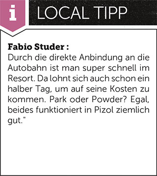 Im Riderpark Pizol, zwischen Gaffia- und Furtlift, kommt man sich vor wie ein Kind im Süßwarenladen: drei Lines mit Kickern und Jibs von Beginner über Medium bis Pro lassen einem das Wasser im Mund zusammen laufen. Die Beginner Line bietet zwei Kicker und sechs verschiedene Boxen. Der Knüller steht in der Medium Line: der Gong Bonk. Eine gut 1,50m große rote Scheibe, die darauf wartet, so richtig Kanten abzukriegen. Daneben gibt es in dieser Line drei Kicker, einen Wallride, drei Boxen und eine Corner. Die Kicker in der Pro Line mit Tables bis zu 13 Metern sind so groß, sie fressen kleine Kicker zum Frühstück. Zusätzlich runden zwei Rails das Angebot ab. Über das ganze Jahr verteilt finden im Park Events mit familiärer Atmosphäre statt. Nach den Fotoshootings für jedermann lohnt sich der Blick auf die Webseite des Riderparks.
