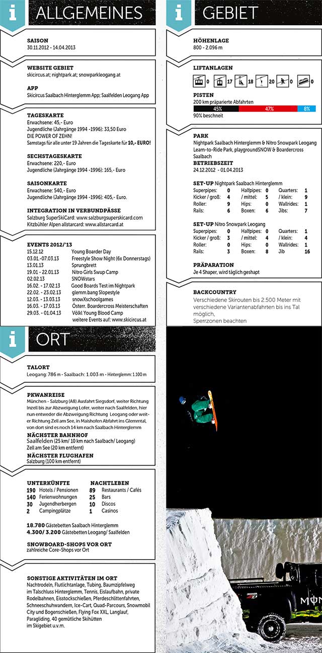 Im Skicircus Saalbach Hinterglemm Leogang stehen Abwechslung, Spaß und Spannung ganz oben auf dem Programm: Abwechslung sollten Freestyler und Freerider durch die 200 Pistenkilometer, die durch 55 Liftanlagen erschlossen und verbunden sind, zur Genüge bekommen. Für den Freestyle-Spaß sorgen die insgesamt über 60 Kicker, Rails, Boxen und Wallrides in den drei Funparks, dem Nightpark im Zentrum Hinterglemms, dem Learn-to-Ride Park in Saalbach und dem Nitro Snowpark in der Leoganger Asitzmulde. Die nicht zu vergessende Spannung kann man beim Freeriden auf der Suche nach unverspurten Lines Im Backcountry der Resorts erfahren.