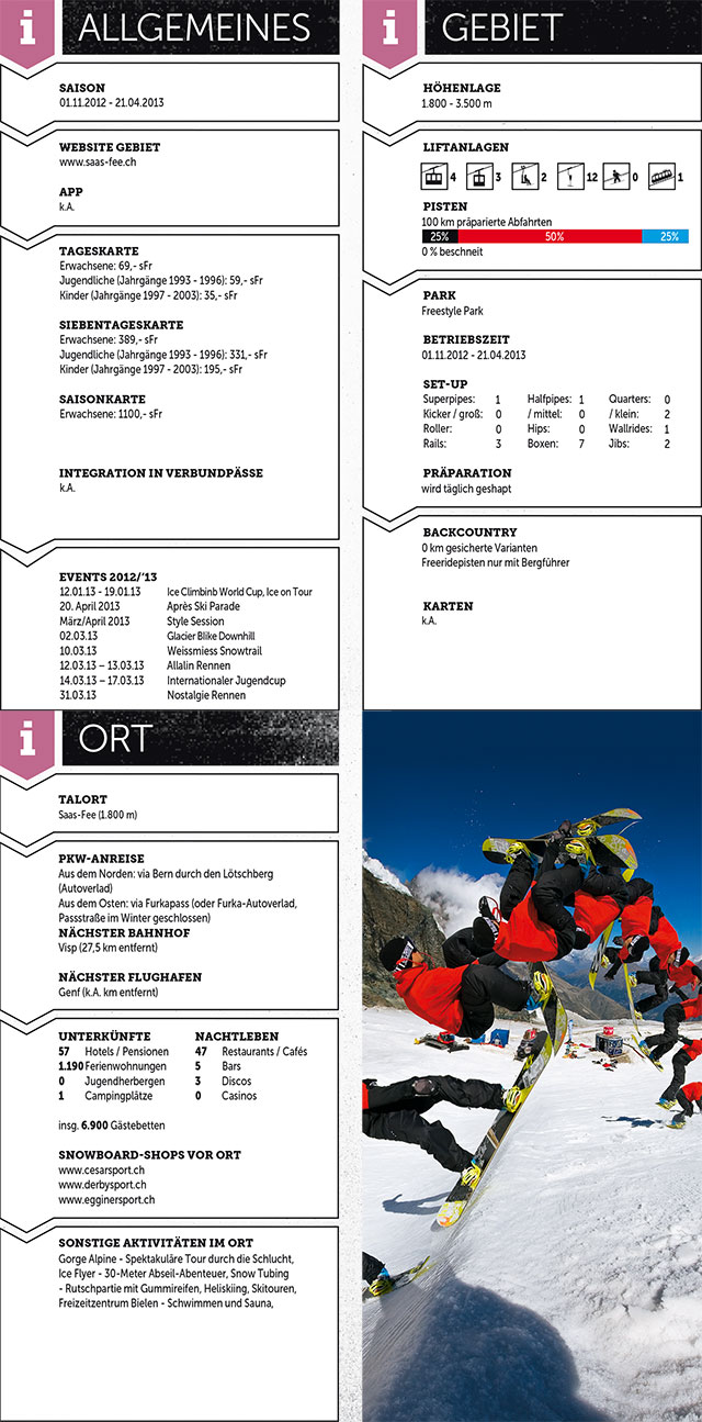 Gäbe es eine Länderinformation der „Freien Ferienrepublik Saas-Fee“ würde dort stehen: Parkfahren zu jeder Jahreszeit, abwechslungsreiche Pisten, Freerideperle. Als Wirtschaftseckpfeiler würde das Auswärtige Amt Fondue, Springbock Drinks und Party in der Popcorn Bar auflisten. Uuswiis bereit halten!