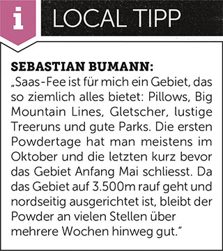 Saas-Fee ist dank des Gletschers im Winter wie im Sommer eine gute Shredlocation: 100 Pistenkilometer zwischen 1.800 und 3.600 Metern – da kommt nie Langeweile auf. Der Ort selbst bietet ein ruhiges Dorfidyll mit autofreien, schmalen Straßen und urigen Kuhställen in Sichtweite von schönen alten Chalets. Die Metro Alpin-Standseilbahn bringt einen unterirdisch rauf auf den Allalin, von dort aus wartet eine einzigartige Aussicht auf geschlagene 13 Viertausendergipfel. Genießen kann man dieses Panorama am besten im Drehrestaurant, das innerhalb einer Stunde bei Speis und Trank eine Rundumsicht à la carte serviert. Anschließend bieten sich zwei Top-to-bottom-Abfahrten mit verschiedenen Schwierigkeitsgraden um den Feegletscher herum bis in den Ort an.