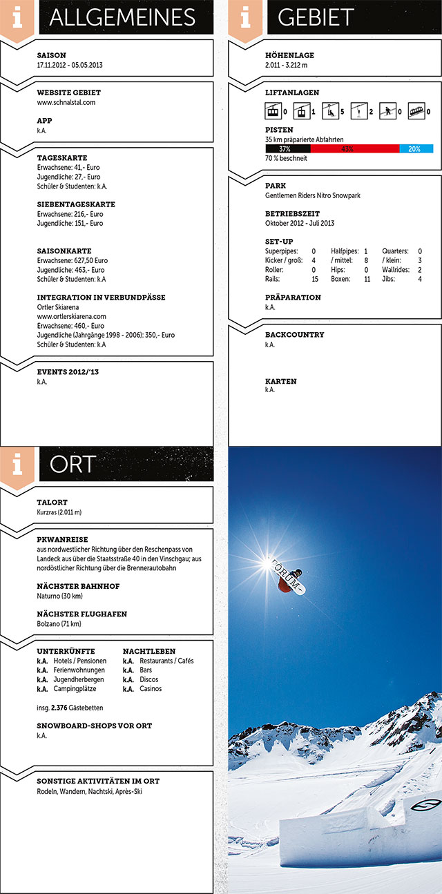 Ins Schnalstal zu fahren und nicht den Park zu rocken, wäre so wie nach Paris zu fahren und nicht den Eiffelturm zu sehen. In den sonnenarmen Monaten Januar und Februar zieht der Park ins Tal an den Glockenlift um. Ansonsten befindet sich die Stahl- und Shapekunst am Gletscher. Für eingefleischte Cracks, Anfänger und alle dazwischen heißt es auf drei Lines verteilt: „Benvenuto!“ Die Easy-Line bietet drei Kicker mit zwei Meter Table, viele Boxen und Rails. Die Medium-Line wartet mit Kickern von sieben bis zwölf Meter Table auf und hat unter anderem einen Pole Jam und verschiedene Rattatat Tubes. Profis fühlen sich bei neun bis zwanzig Meter Tables wie zu Hause – Stair-Set und Wall machen das Heim komplett. Dutzende weitere Railfeatures ziehen Jibheads an wie das italienische Dolce Vita hübsche Frauen.