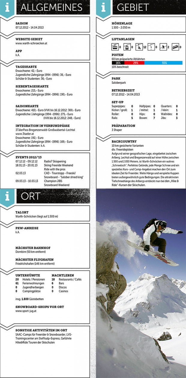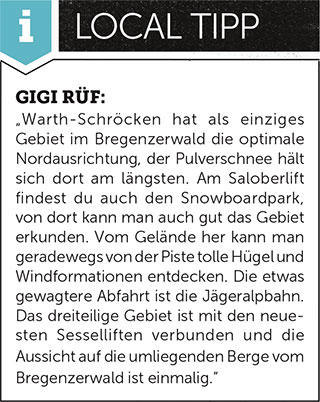 Die Gebete der Freestylejünger wurden unter dem Sonnencruiser-Sessellift erhört: Der Saloberpark fängt easy und entspannt an, zum Aufwärmen gibt es ein paar kleine Bumps und Jibs. Anschließend teilt sich der Park in zwei Lines auf. Dank der bereits erwähnten Schneemengen, die in Warth-Schröcken runterkommen, werden hier Kicker in sämtlichen Kalibern aufgeschoben. In der zweiten Line ist die weiße Pracht gespickt mit Jibs in Form von Boxen, Picknicktischen und Rails – wie Schokosplitter im Stracciatella-Eis. Lecker! Selbst das Zuschauen in den Sesseln ist himmlisch: die neue Chill Area sorgt für gediegene Vibes mit gemütlichem Sound.