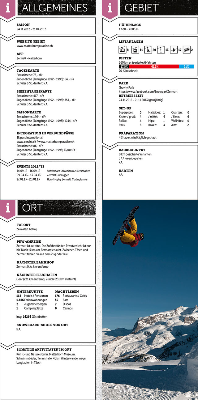 In den Alpen gibt es kein Wintersportgebiet, das Zermatt in der Kombination aus Größe und Höhe das Wasser reichen kann: Mit Pisten vom Rothorn über Gornergrat zum Matterhorn und Schwarzsee unterstreicht Zermatt sein Potenzial, weshalb der Ort auch den Namen “Matterhon glacier paradise” zurecht trägt. Das Sahnehäubchen sind Shred-Sessions im Sommer auf dem Gletscher. Wäre Zermatt in einem Quartett, wären die Fakten stechend: Höchster Lift ist der Gobba di Rollin (Gletscher) mit 3.899 Meter, insgesamt 360 Pistenkilometer und die längste Abfahrt kommt auf stolze 23 Kilometer – allein beim Lesen kribbelt es in den Wadeln! Freunde von Pisten so schwarz wie die Nacht kommen um den Trockenen Steg, Schwarzsee oder Furi nicht herum. Wie man sieht ist Zermatt wie ein All-You-Can-Eat-Buffet, das keine Wünsche offen lässt.
