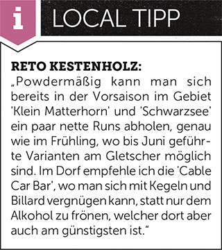 Zermatt spielt in Sachen Tiefschnee in einer anderen Liga – folglich sind in diesem hochalpinen Gelände Lawinenausstattung und ein Guide Pflicht. Ferner gibt es 38 Kilometer unpräparierte gelbe Pisten, die mit einem Lift erreichbar und lawinensicher markiert sind. Solche ausgewiesenen Powder-Routen sind der Nordhang des Stockhorn, der 1.200 Höhenmeter verspricht, und das Hohtälli. Tiefschneeabfahrten mit südlicher Exposition sind am Rothorn zu finden. Wer sich damit noch nicht zufrieden gibt, der kann mit dem Helikopter auf die einsamen Gipfel des Monte Rosa, Alphubel und Aeschihorn fliegen. Anschließend kann man bis zu 2.600 Höhenmeter hinunterbrettern und sich daran erfreuen, dass Zermatt einer der wenigen Orte in Europa ist, in dem Heliboarding erlaubt ist.