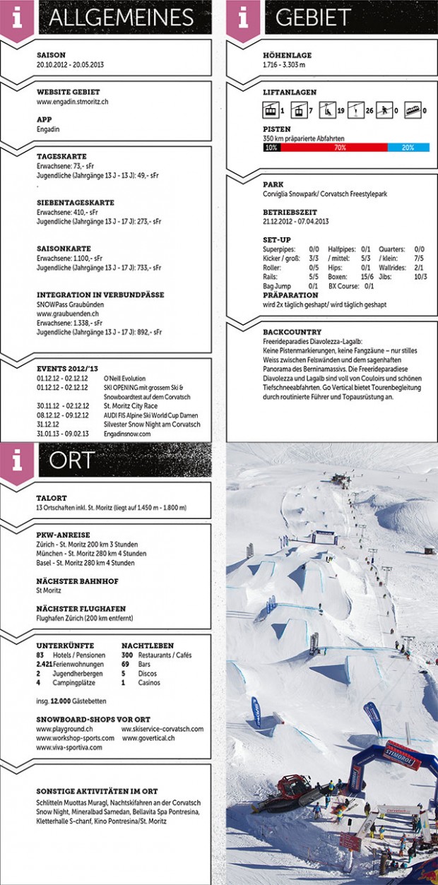 Hat man sich auf den grundsätzlich südlich ausgerichteten Hängen erstmal warm gefahren, wechselt man auf die gegenüberliegende Seite des Tals. War die Corviglia noch Lehrzeit, so ist der Corvatsch das Gesellenstück des Oberengadins. Kein Wunder findet hier seit beinahe einer Dekade der Engadinsnow statt, einer der etabliertesten Freeride- und Slopestyle-Contests des Kontinents. Die anspruchsvollen Rinnen und Couloirs fordern schon einiges an Erfahrung und Skills. Man beweist mehr Mut, Nein zu sagen, anstatt sich im steilen Gefälle zu überschätzen. Lieber holt man sich den Respekt im fetten Freestyle Park (inklusive Bagjump), der sich ebenfalls aus dem Engadinsnow entwickelt hat. Und erstmals seit diesem Jahr wird eine Halfpipe am Corvatsch stehen.