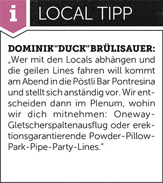 Eines sollte man sich auf keinen Fall entgehen lassen: die hinter Pontresina gelegene Diavolezza. Vom Gipfel der knapp dreitausend Meter hohen „Teufelin“ eröffnet sich der Blick auf eine der atemberaubendsten Kulissen der Alpen. Wer mit Lawinenequipment gerüstet ist, findet hier den Ursprung des Playgrounds in Paradise. Der Berg gilt als der Big-Mountain-Spot schlechthin und die Variante entlang des Morteratschgletschers runter zur gleichnamigen Bahnstation gehört bei Neuschnee in jedes Freerider-Fahrtenbuch.