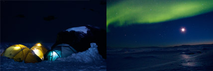 In völliger Zufriedenheit besteigen wir den Hubschrauber und treten den Rückflug an. Unser norwegischer Pilot Håkon ist von unseren Lines so begeistert, dass er uns mit einem Tiefflug zwischen den Eisbergen hindurch die Fjorde entlang zurück nach Tasiilaq lohnt. Ende gut, alles gut. Bevor wir die Heimreise antreten, brechen wir ein letztes Mal mit unseren Schneeschuhen und den Zelten im Gepäck auf. Bei einsetzendem Schneefall bauen wir die Zelte auf und geniessen zum Abschluss dieser unvergesslichen Reise das Land in seiner rauen Schönheit unter freiem Sternenhimmel.