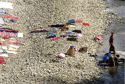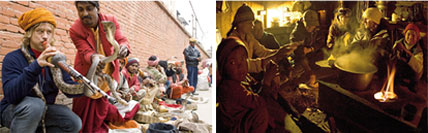 Vom Hotel aus führt uns unsere Entdeckungstour auf den Thamel, die Einkaufstrasse von Kathmandu für Touristen und die privilegierte nepalesische Oberschicht. Wie von Zauberhand verschwinden beim Einbiegen in diese Ecke Kathmandus die Abfallhaufen, und die streunenden Kindern machen tüchtigen Geschäftsmännern mit Handy am Ohr platz. Die Menschen hier sprechen englisch, und die meisten von ihnen wissen, dass Frankreich – zu ihrem Stolz genau wie Nepal – seinen König für die Republik gestürzt hat. Der einzige Unterschied: Die Revolution in Nepal vollzog sich vor gut einem Jahr, und dem Monarchen wurde der Kopf erfreulicherweise nicht abgehackt. Doch all das lenkt uns nicht von den überirdisch schönen Gesichtern der nepalesischen Frauen ab. An jeder Ecke, in jedem Restaurant, in jedem Shop – überall lächeln uns Schönheiten entgegen, die unter dem Strich selbst die reichlich verehrten Schwedinnen schlagen. Es scheint, als ob jemand die Vorzüge der indischen, der mongolischen und der tibetanischen Gesichtszüge genommen und im Aussehen der nepalesischen Frau vereint hat.