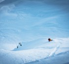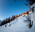 Die Berge präsentierten sich von ihrer besten Seite und waren mit einer märchenhaften Schicht Puderzucker überdeckt. Mit jedem Spray liessen wir die Kristalle magisch in der Luft umher tanzen und jauchzten laut während wir die Westflanke des Gipfels im Abendlicht hinunter cruisten. Als wir wenig später im Abendrot schimmernden Lärchenwald ankamen, endeckten wir unverhofft einen massiven Pillowdrop über unserer Aufstiegsspur. Die mögliche Airtime war so verlockend, dass wir uns vor unserer Rückkehr ins Chalet auch von der bissigen Kälte nicht abhalten liessen, noch einen Sprung in den Sonnenuntergang zu wagen.