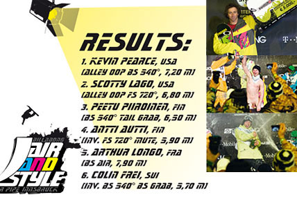 Rollen wir das Feld von hinten auf: Kim Rune Hansen versuchte es wieder mit einem Bs 5 Rodeo, doch diesmal konnte er den Flug nicht kontrollieren, landete im Flat, blieb liegen und schied verletzt aus. Markus ´Mä´ Keller war mit 25 der Oldie unter den Finalisten. Er konnte zwar keinen seiner massiven McTwists stehen, bewies aber mit einer McTwist-to-Coping-to-Frontflip-Off-Flat-Bomb, dass Schweizer anscheinend wie Gummimenschen gebaut sind. Colin Frei, der zweite Schweizer im Finale, der sich bei der Qualifikation lange auf Platz eins gehalten hatte, zeigte einen Inverted Bs 5 Method. 5,7 Meter und 215 Punkte langten allerdings nur für Platz 6. Der höchste Sprung des Finaldurchgangs, ein Backside Air auf 7,9 Meter, brachte Arthur Longo den 5. Platz ein. Und wie man es mittlerweile beim Air & Style gewohnt ist, kündeten die Sprechchöre den nächsten Fahrer an. Frage: „Antti?“ Antwort: „Autti!“ Angefeuert segelte der Finne einen Inverted Frontside 7 Mute auf fast 6 Meter und landete mit 241 auf dem undankbaren vierten Platz. Von den drei übrigen Fahrern schien eigentlich Peetu Piiroinen die besten Karten zu haben, lag er doch in der Quali noch weit vor Pearce und Lago. Aber im Finale wurden die Karten neu gemischt und er musste sich hinter den beiden Amerikanern mit einem 6,5 Meter hohen Backside 5 Tailgrab auf dem dritten Platz einreihen. „Alles oder Nichts“ hiess es für Scotty Lago vor seinem dritten Sprung. Er heizte dem Publikum noch einmal so richtig ein und schoss sich unter ohrenbetäubenden Jubelschreien 6,8 Meter aus der Quarter. Seinen Alley Oop Frontside 7 setzte er dann mit spielerischer Leichtigkeit in die Landung und erhielt dafür satte 258 Punkte. Diese sollten aber nicht ausreichen um ganz nach oben auf das Siegerpodest zu steigen. Denn dort stand schon niemand geringerer als der Sieger des Air & Style in München: Kevin Pearce. KP zeigte in seinem zweiten Run einen astreinen Backside 5 Alley Oop Mute auf 7,2 Meter Höhe. Damit hatte er sich mit 270 Punkten so weit in Führung gebracht, dass ihm der zweite Air & Style Sieg innerhalb einer Saison nicht mehr zu nehmen war. Damit ist er nach Ingemar Backman, Stefan Gimpl (der Einzige mit einem Hattrick) und Shaun White der vierte Fahrer, der zwei Air & Style Titel sein eigen nennen darf. Allerdings ist er der erste, der diese Ausnahmeleistung innerhalb einer Saison geschafft hat. Als bei der anschliessenden Siegerehrung Andrew Hourmont dem 20-jährigen Pearce den Ring of Glory auf den Finger setzte, verzog dieser keine Miene – alles Routine!