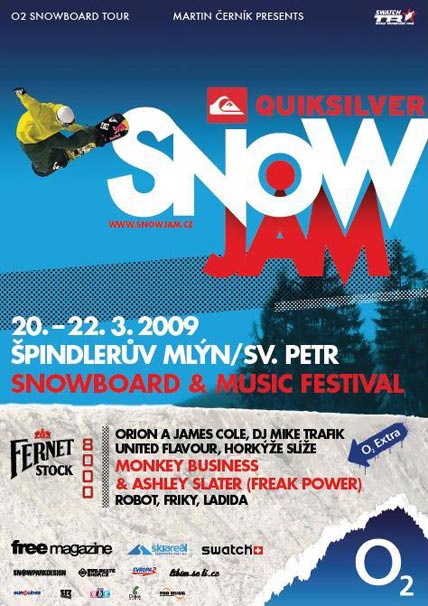 Der Quiksilver Snowjam 2009 ist Teil der tschechischen O2 Snowboard Tour, und wird auch dieses Jahr wieder stattfinden, und zwar vom 20.-22.März 2009 in Špindlerův Mlýn (Spindlermühle/Riesengebirge).
