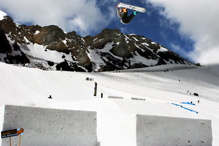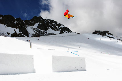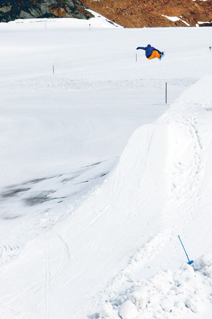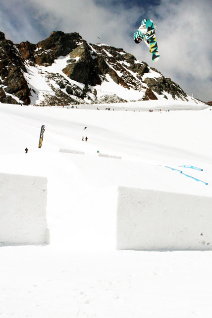 Auch am Donnerstag ist das Wetter nicht viel besser. Von Wegen Summercamp mit Sonne und Slush – der Park ist hart wie Beton. Die Shaper haben das Table des Kickers auf stattliche 24 Meter verlängert, der Takeoff ist knapp vier Meter hoch – ganz nach den Vorstellungen des Teams…