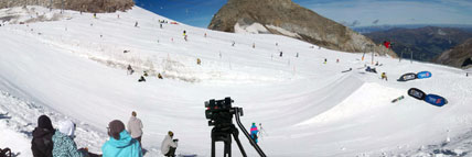 Das bunte Treiben ist bereits voll im Gange. Mehrere Hundert Shredder kosten die erste Airtime und schmeissen sich über das reichhaltige Rail-Angebot. Die Bedingungen im Park sind erstaunlich gut. Es scheint so, als hätte man sämtliche bewegbaren Schneereste auf dem Gletscher zusammengekratzt und für die Obstacles verbaut. An dieser Stelle ein Riesen-Lob an die Shape-Crew!