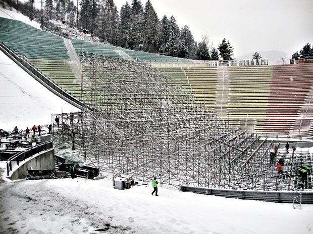 Steht erst einmal das Gerüst aus Stahl und Holz, wird der Schnee aufgetragen. Der Stubaier Gletscher sorgt bei der Mutter aller Snowboard-Contests als offizieller Schneelieferant für “Schneesicherheit”. Mehr als 700 Kubikmeter Schnee werden vom Stubaier Gletscher ins Bergisel Stadion transportiert um perfekte Bedingungen für den 6Star TTR Event zu gewährleisten. Bis zu den ersten Trainingssprüngen am 03.02. haben die rund 200 Mitarbeiter vor Ort einiges zu tun. Neben dem Kicker sind die Bereiche für Medien, VIPs und die Wettkampfrichter aufzubauen. Auch die Infrastruktur für die TV-Live-Übertragung mit insgesamt 8 Kameras muss aufgebaut werden. Nicht zuletzt entsteht eine große Musikbühne für die Live-Acts Jan Delay und Pennywise. Alleine 29 Tonnen Equipment sorgen für den richtigen Sound und das perfekte Licht.