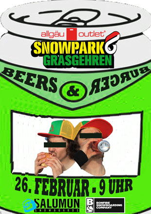 Salomon und Bonfire zeigen sich mal wieder spendabel und karren kiloweise feinstes Rinderhack und wohlschmeckendes Dosenbier in den Snowpark Grasgehren. Kenner wissen was das bedeutet: Eine spaßige Park-Session mit kostenloser Verpflegung, die für den einen oder anderen im Vollrausch enden wird.