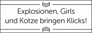 ›…oder jemanden beim Kotzen. ›Ja manchmal, aber viele Amerikaner zum Beispiel finden Kotzen total ekelerregend. Ich dagegen liebe Kotzen, ich klicke immer Play wenn ich jemanden kotzen sehe. Explosionen, Girls und Kotze bringen Klicks!